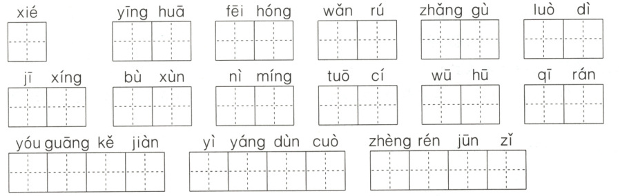 1. “|xié|”对应词语为“携”,注意与“镌”等形似字区分。“yīng huā”写作“樱花” ;“fēi hóng”写作“绯红”;“wǎn rú”写作“宛如”;“zhǎng gù”写作“掌故”;“luò dì”写作“落地”;“jī xíng”写作“畸形”;“bù xùn”写作“不逊”;“nì míng”写作“匿名”;“tuō cí”写作“托辞”;“wū hū”写作“呜呼”;“qī rán”写作“凄然”;“yóu guāng kě jiàn”写作“油光可鉴”;“yì yáng dùn cuò”写作“抑扬顿挫”;“zhèng rén jūn zǐ”写作“正人君子”。