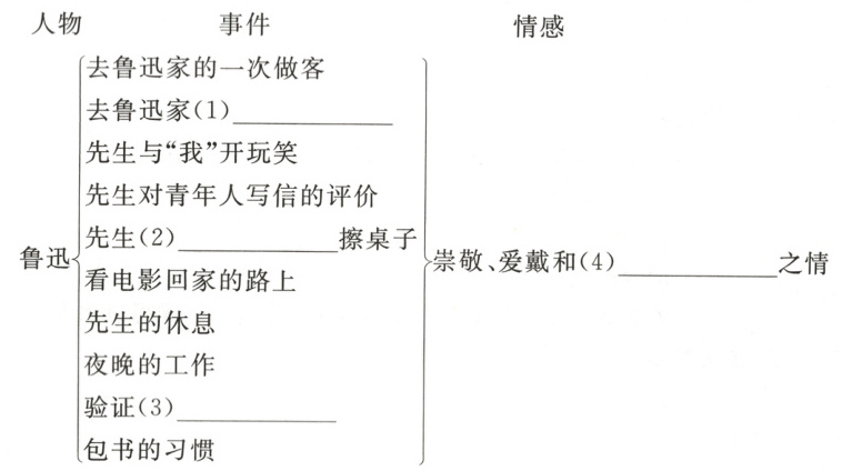(1)根据课文内容,“我”去鲁迅家除了做客,还有“包饺子”的情节;(2)文中提到鲁迅先生“亲自”擦桌子,体现其平易近人;(3)鲁迅先生会验证“鱼丸是否新鲜”,展现其认真细致;(4)作者对鲁迅先生的情感除了崇敬、爱戴,还有“怀念”之情。