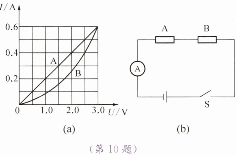 10. 有两个电路元件A和B,流过元件的电流与其两端电压的关系如图(a)所示。把它们串联在电路中,如图(b)所示。若闭合开关S后,电流表的示数为$0.4 A$,则电源电压和元件B的电功率分别是 (