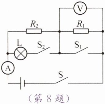 8. 如图所示,电源电压恒定,$R_1$、$R_2$为定值电阻,$R_2 = 20\ \Omega$,灯泡L上标有“$6 V \ 3 W$”字样。
