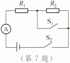 7. 如图所示的电路中,$R_1$的阻值为$4\ \Omega$,当开关$S_1$和$S_2$都闭合时,电流表示数为$3 A$;当只闭合开关$S_2$时,电流表示数为$2 A$。下列说法中正确的是 (