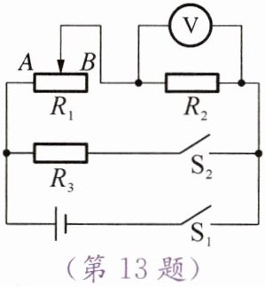 13. 如图所示,电源电压不变,滑动变阻器$R_1$的最大阻值为$20\ \Omega$,$R_2 = 5\ \Omega$,$R_3 = 10\ \Omega$。