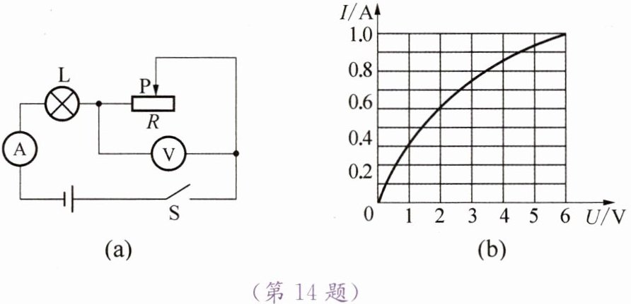 14. 在图(a)所示的电路中,电源电压为$9 V$且保持不变,电流表选用的量程为“$0~3 A$”,电压表选用的量程为“$0~15 V$”,灯泡上标有“$6 V \ 6 W$”字样,灯泡中的电流随电压变化的关系如图(b)所示。