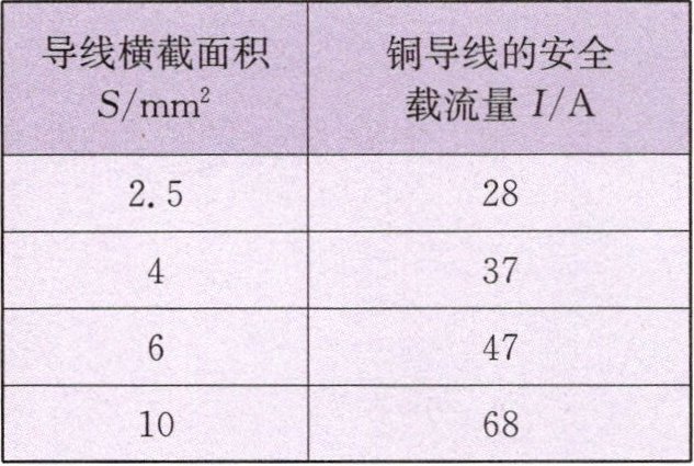(2)在家庭电路中,所选导线的横截面积应与家用电器的总功率相适应,以确保用电安全。右表是几种常见铜导线的安全载流量(即长时间通电的最大安全电流)。小明家现要安装一台最大额定功率为$8.5 kW$的即热式电热水器,该用电器正常工作时的最大电流是