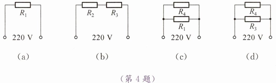 (1)某品牌即热式电热水器的加热器分别由阻值为$R_1$、$R_2$、$R_3$、$R_4$($R_1 < R_2 < R_3 = R_4$)的电热丝通过多个挡位控制,得到多种不同的连接方式,但每种连接方式最多只有两根电热丝参与连接。现选取其中的四种连接方式(如图所示),其中加热功率最大的是