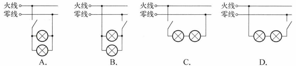 B选项:开关接在零线与两灯并联电路之间,不符合安全用电要求,开关应接火线。