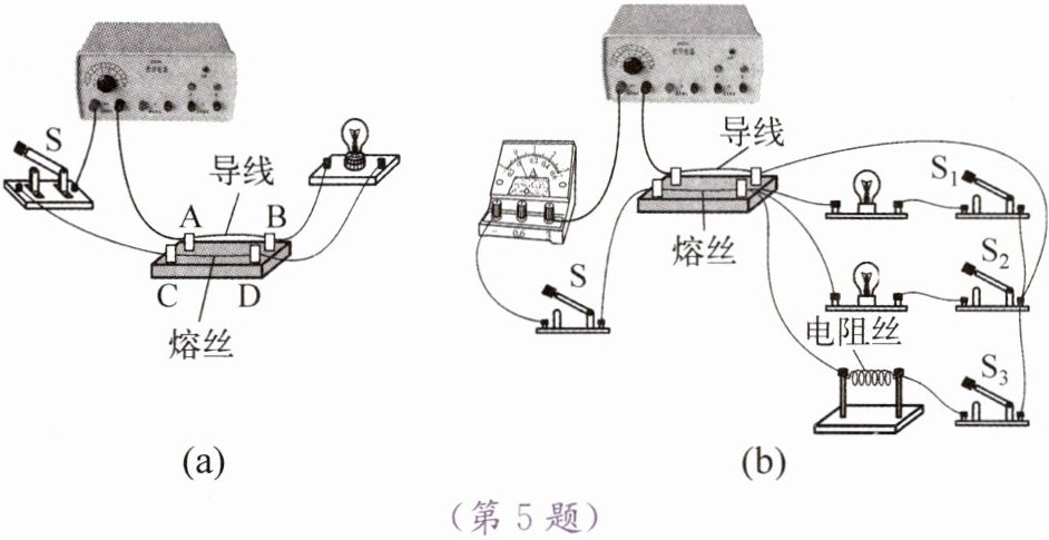 5. 在探究熔丝熔断的原因时,小明设计了如图(a)所示的电路,在接线柱$C$、$D$间接入熔丝,接线柱$A$、$B$间接入导线。接通电源(6 V),闭合开关S,灯泡正常发光,熔丝未熔断。断开电源,在$A$、$B$、$C$、$D$四个接线柱的