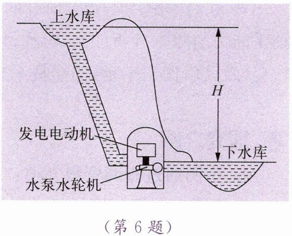6. 如图所示,抽水蓄能电站是为了解决电网高峰、低谷之间供需矛盾而设计建造的,是间接储存电能的一种方式。在夜间用电低谷时,它从电网取电,用电动机驱动水泵,将水从下水库抽到上水库;次日用电高峰时,水从上水库流到下水库,使水轮机带动发电机发电,将电送入电网。我国首座抽水蓄能电站一年抽水用电量约$2×10^{9}kW· h$,发电量约$1.5×10^{9}kW· h$,每年可节约标准煤约$1×10^{5}t$。