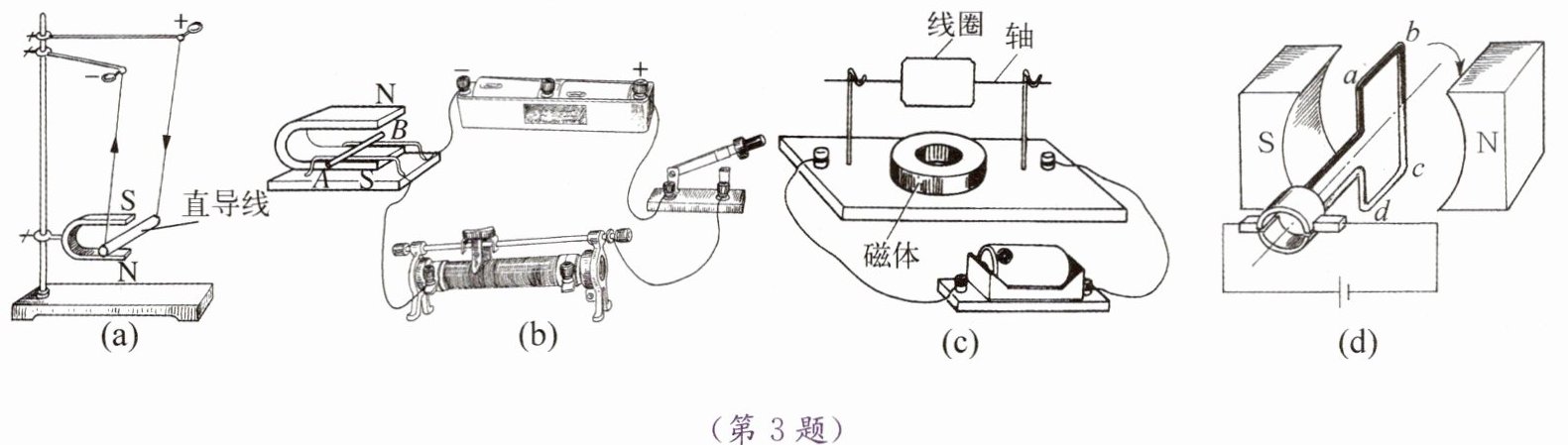 3. 在探究磁场对电流的作用活动中,小明先从简单的实验入手进行探究。他先把通电直导线放入磁场中,观察它的运动情况;再把通电线圈放入磁场中,观察它的运动情况。从实验中收集证据并加以分析,最后得出结论。