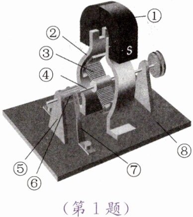 答案:1.① 蹄形磁体 ② 弧形铁片 ③ 线圈 ④ 转轴 ⑤ 支架 ⑥ 换向器 ⑦ 电刷 ⑧ 底座