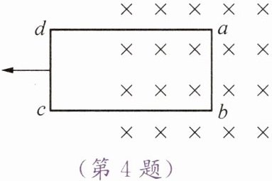 4. 如图所示,闭合导线框$abcd$的一部分处于磁场中,图中的“×”表示磁场的方向垂直于纸面向内。当导线框向左运动时,导线框内会产生感应电流。在这个回路中, (