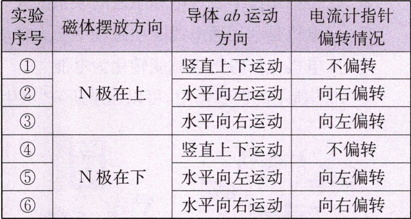 (2)闭合开关,小芳无意间碰到导体$ab$,导体$ab$晃动起来,小明发现电流计指针发生了偏转,就说:“让导体在磁场中运动就可产生电流。”但小芳说:“不一定,还要看导体怎样运动。”为验证猜想,他们继续探究,观察到的现象如右表所示。