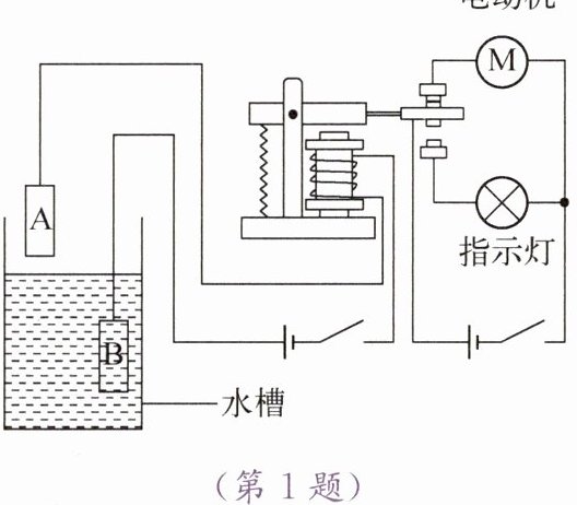 1. 如图所示为液面高度控制装置,水槽中的两个金属片 A、B 可看成最简单的传感器,它与电磁继电器构成控制电路,而电动机和指示灯与电磁继电器则构成受控电路。电动机的作用是带动水泵向水槽中加营养液。