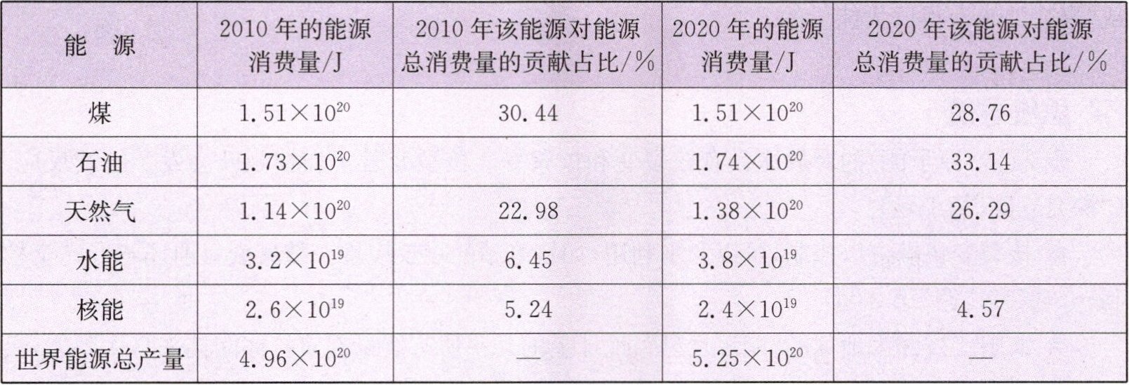 11. 下表列出了2010年和2020年世界能源生产的变化情况。请根据表中所提供的信息回答问题。