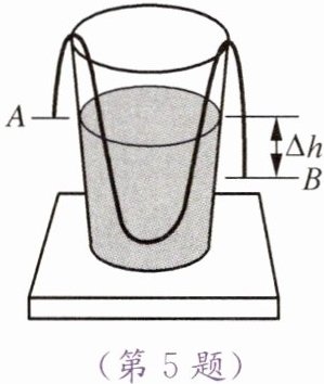 5. 如图所示,截取一段棉纱鞋带的中段,将其两端剪齐后浸在盛有水的玻璃杯中。鞋带的两端留在杯外,自由下垂,使A端比杯内的水面稍高,B端比杯内的水面低1~2 cm。过一段时间后,A端