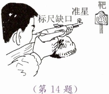 14. 如图所示,小刚对子弹击穿木板靶心后的能量变化进行思考,提出以下四点看法: