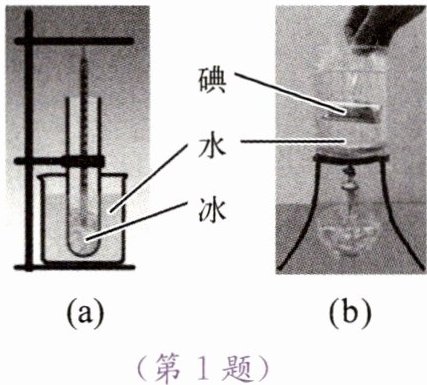 1. (南京)图(a)为探究冰熔化特点的实验装置,图(b)为观察“碘锤”中物态变化的实验装置。已知标准大气压下,冰和碘的熔点分别是$0\ ^{\circ} C$和$113.5\ ^{\circ} C$。对比两个实验,有以下判断: