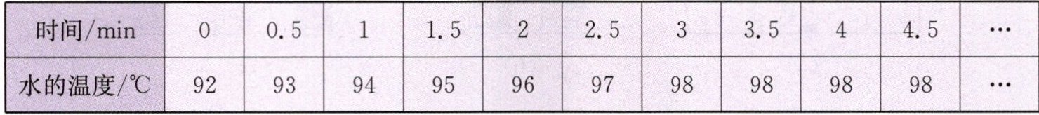 (2) 当水温升到$92\ ^{\circ} C$时,每隔$0.5\ min$记录一次温度计的示数,部分数据记录如下表所示。分析表中数据可知,水的沸点是