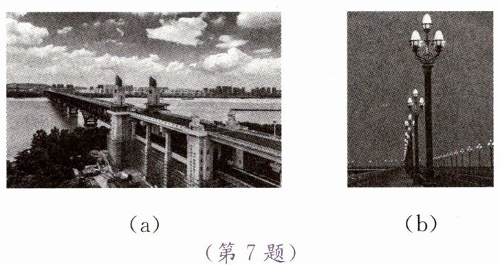 7. (南京)南京长江大桥是我市的地标性建筑,现已焕然一新并顺利通车,如图(a)所示。图(b)中,大桥上玉兰花灯内的钠灯全部换为$LED$灯后,总功率减少了约$180\ kW$。与原来相比,所有灯工作$5\ h$可节约电能