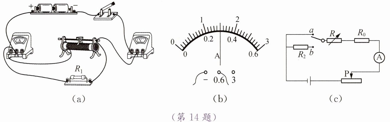 (2) 图(c)是能巧测$R_2$阻值的实验电路。图中$R$为电阻箱,$R_0$为定值电阻(阻值未知),要求仅利用电阻箱读数表达$R_2$的阻值,请在空白处填上适当内容。