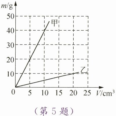 5. 分别由甲、乙两种物质组成的物体,其质量与体积的关系如图所示。分析图像可知,两种物质的密度之比$\rho_{甲}:\rho_{乙}$为