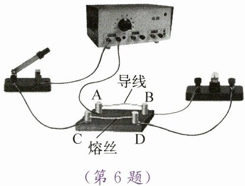 6. 如图所示,在接线柱 A、B 间接入导线(其材料为普通铜丝),在接线柱 C、D 间接入熔丝。接通电源,灯泡正常发光,熔丝不熔断;断开电源,在 B、D 间连上一根导线,再次接通电源时,灯泡不亮,熔丝熔断。下列判断中错误的是
