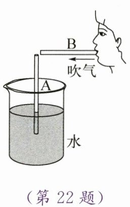 22. (3 分)如图所示,往吸管 B 中吹气,可以看到吸管 A 中的水面