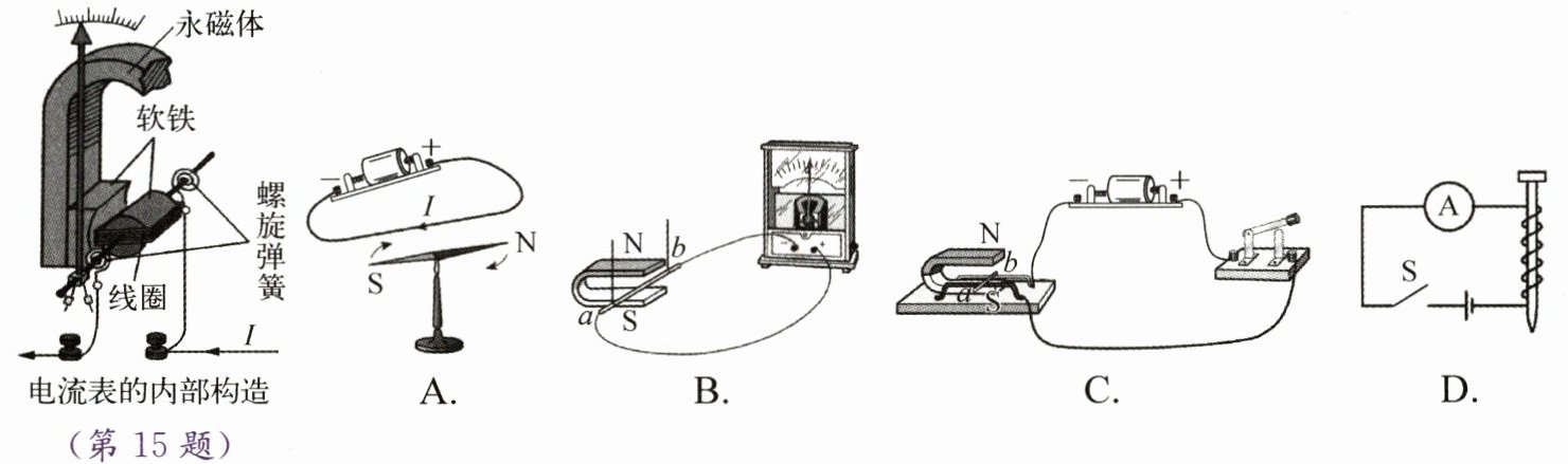15. 如图所示为实验室常用电流表内部构造图。多匝金属线圈悬置在磁体的两极间,线圈与一根指针相连。当线圈中有电流通过时,它受力转动带