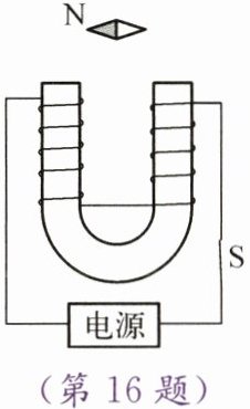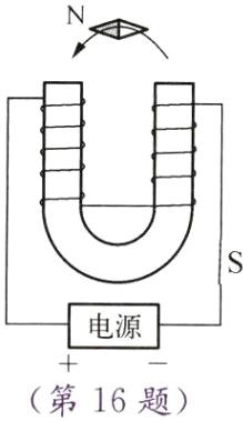16. 根据小磁针静止时所指的方向,在图中画出通过小磁针中心的一条磁感线,并标出电源的正负极。