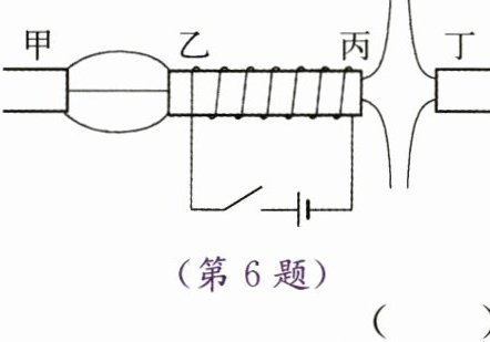 6. 电磁铁和磁体的位置如图所示,由磁感线的分布情况可以判断,磁极甲、乙、丙、丁分别是 (