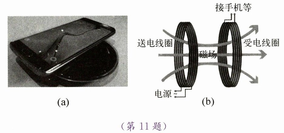 11. 如图(a)所示,有的手机放在充电台上就可以实现无线充电。如图(b)所示是无线充电的原理示意图,给充电台内的送电线圈通入一定频率的交变电流,在它周围形成交变磁场,手机内的受电线圈中产生一定的电流,从而将能量从发射端转移到接收端。送电线圈和受电线圈工作对应的物理知识分别是 (
