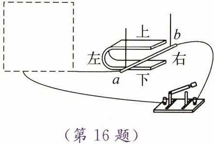 16. 在如图所示实验装置的虚线框中接入一个什么元件,可探究电磁转换现象中的哪一个实验?其主要的能量转化情况是什么?