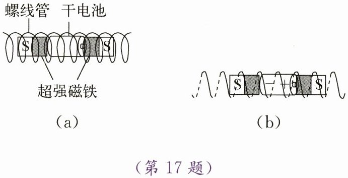17. 把两块超强磁体分别吸附在干电池两端的正负极上,制成电磁动力“小车”,并将它放入铜质螺线管中,螺线管和磁体接触良好,如图(a)所示,“小车”就能沿着螺线管运动。图(b)是它的示意图。