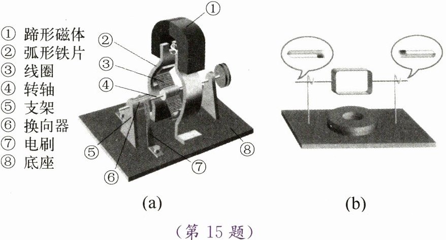 15. 图(a)是直流电动机模型(主要部件见文字说明),图(b)是自制简易电动机模型。现在主要讨论如图(b)所示简易电动机的制作与操作问题: