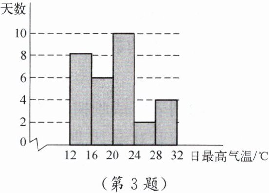 3. 为了解某个季度的气温情况,用适当的抽样方法从该地这个季度中抽取 $30$ 天,对每天的最高气温 $x$(单位:$^{\circ}C$)进行调查,并将所得的数据按照 $12 \leq x<16,16 \leq x<20,20 \leq x<24,24 \leq x<28,28 \leq x<32$分成 $5$ 组,得到如图所示的频率分布直方图.