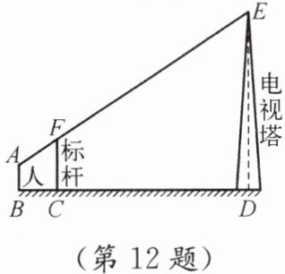 12. 如图,某测量工作人员的眼睛与标杆顶端$F$以及电视塔顶端$E$在同一直线上.已知此人身高为$1.6 m$,标杆为$3.2 m$,且$BC = 1 m$,$CD = 5 m$,则电视塔的高$ED =$