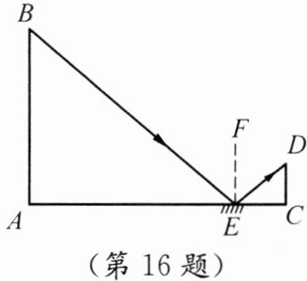 16. (10 分)如图,为测量学校教学楼的高度,小强在地面上放一面镜子(镜子高度忽略不计),他刚好能从镜子中看到教学楼的顶端$B$(如图).他请同学协助测量了镜子与教学楼之间的距离$EA = 21 m$,以及他与镜子之间的距离$CE = 2.5 m$. 已知他的眼睛距离地面的高度$DC = 1.6 m$. 请你帮助小强计算出教学楼的高度$AB$.(提示:根据光的反射定律,可知反射角 = 入射角)