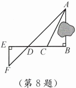 8. 为了测量被池塘隔开的 A、B 两点之间的距离,根据实际情况,画出如图所示的示意图,其中 AB⊥BE,EF⊥BE,AF 交 BE 于点 D,点 C 在 BD 上.有四位同学分别测量出以下四组数据:① BC、∠ACB;② CD、∠ACB、∠ADB;③ EF、DE、BD;④ DE、DC、BC.其中,能作为已知条件求出 A、B 间距离的有(