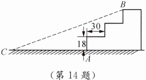14. 如图,某公园入口处原有三级台阶,每级台阶高为 18 cm,宽为 30 cm.为方便使用轮椅的人通行,拟将台阶改为斜坡,设台阶的起点为 A,斜坡的起始点为 C,现设计斜坡 BC 的坡度 i = 1∶12,则 AC 的长度是