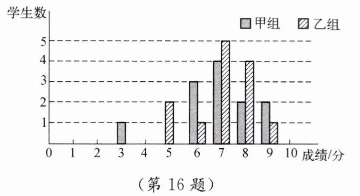 16. (8分)一次综合实践活动课测验,学生得分均为整数,满分10分,成绩达到6分以上(包括6分)为合格。成绩达到9分为优秀。这次测验中,甲、乙两组学生成绩分布的条形统计图如图所示。