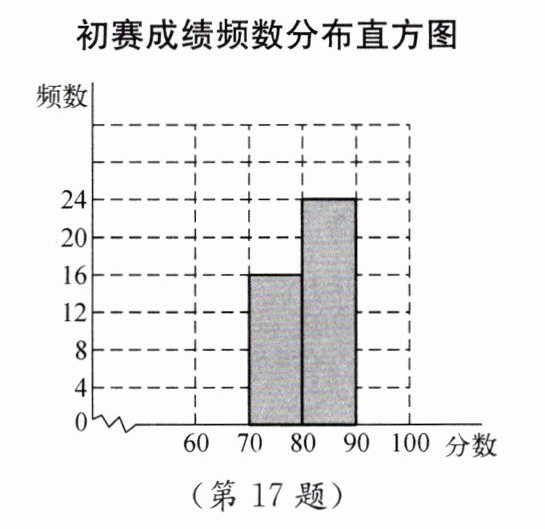 17. (10分)九年级(1)班48名学生参加学校举行的环保知识竞赛初赛。赛后,班长对成绩进行分析,制作如下的频数分布表和频数分布直方图(未完成),余下8名学生成绩尚未统计,这8名学生成绩如下:60,90,63,99,67,99,99,68。
