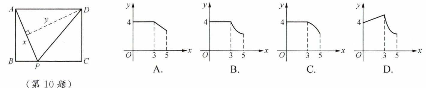 10. 如图,在矩形ABCD中,AB=3,BC=4,动点P从点A出发,按A→B→C的方向在AB和BC上移动,记PA=$x$,点D到直线PA的距离为$y$,则$y$关于$x$的函数图像大致是(