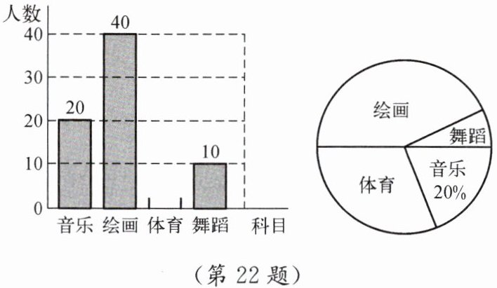 22. (10分)某校计划开设4门选修课:音乐、绘画、体育、舞蹈.学校采取随机抽样的方法进行问卷调查(每个被调查的学生必须选择而且只能选择其中一门),对调查结果进行统计后,绘制了如下不完整的两个统计图.