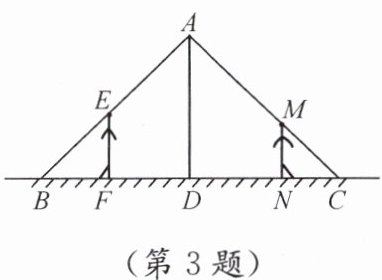3. 如图,小强和小华站在路灯下,小强的身高$EF = 1.8\ m$,小华的身高$MN = 1.5\ m$,他们的影子恰巧等于各自的身高,即$BF = 1.8\ m$,$CN = 1.5\ m$,且两人相距$4.7\ m$.求路灯$AD$的高度.
