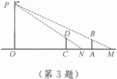 3. 学习了相似三角形的知识后,小明想利用路灯的光线测量一路灯的高度,并作出了示意图.如图,路灯杆顶(点$P$)距地面若干米,身高为$1.6\ m$的小明站在距路灯底部(点$O$)$20\ m$的点$A$时,影的长度$AM$为$5\ m$.