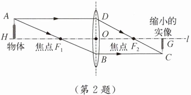 2. 凸透镜成像的光路如图所示,$AD // l // BC$.若物体到焦点$F_1$的水平距离$HF_1$与焦点$F_1$到凸透镜光心的距离$F_1O$的比为$5:4$,则物体被缩小到原来的(