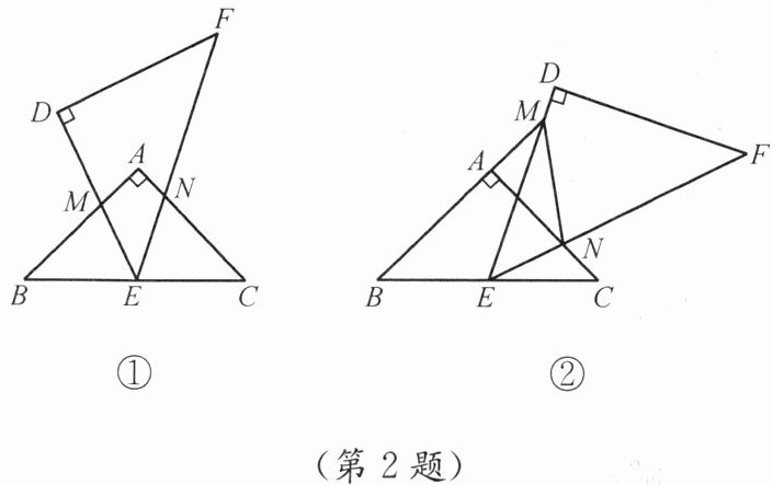 2. 如图,已知$\triangle ABC$和$\triangle DEF$是两个等腰直角三角形,$\angle A = \angle D = 90^{\circ}$,$\triangle DEF$的顶点 E 位于$\triangle ABC$的边 BC 的中点上.