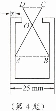 4. 如图,已知某零件的外径为 25 mm,现用一个交叉卡钳($AC=BD$,$OC=OD$)测量零件的内径 AB. 若$OC:OA = 1:2$,测得$CD = 10\ mm$,则零件的厚度$x =$