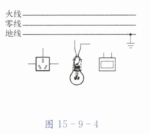 12. 用笔画线代替导线,将图15 - 9 - 4中的三线插座、灯泡及控制灯泡的开关接到家庭电路中。