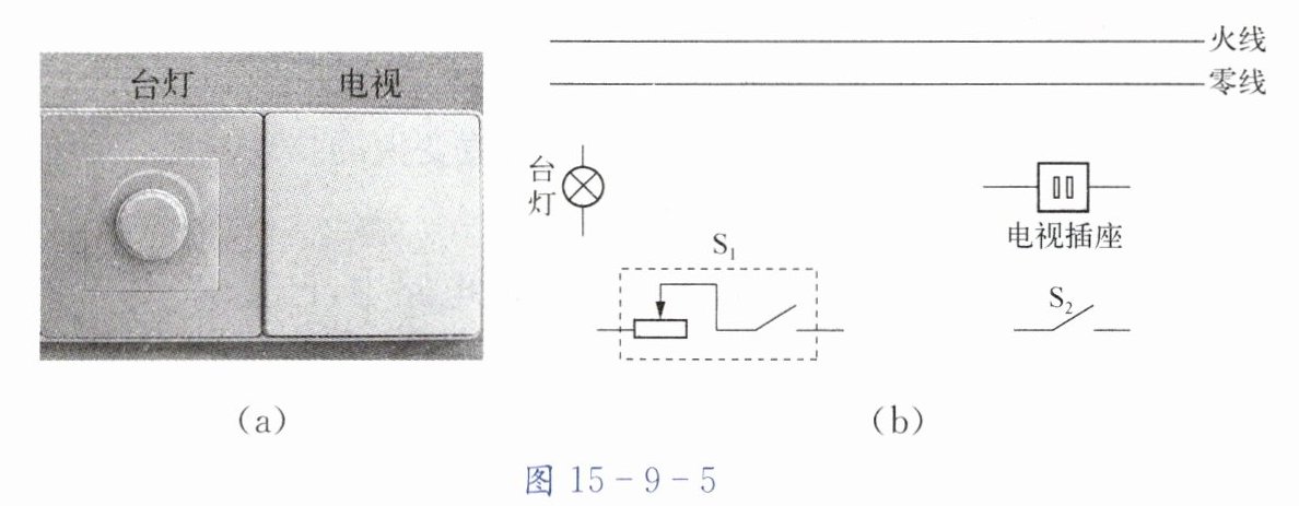13. 图15 - 9 - 5(a)所示是床头柜上的开关示意图,图15 - 9 - 5(b)所示是其控制的电路,其中$S_1$为旋钮开关,单独控制台灯的通断和亮度;$S_2$为单独控制电视插座的开关。请在图15 - 9 - 5(b)中将电路图连接完整。